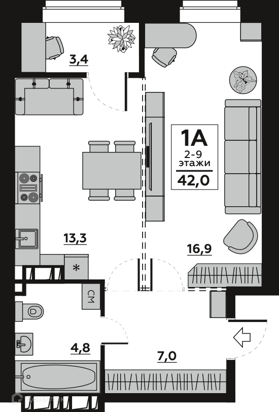 - ✅ Просторная жилая площадь: 16.87 м².