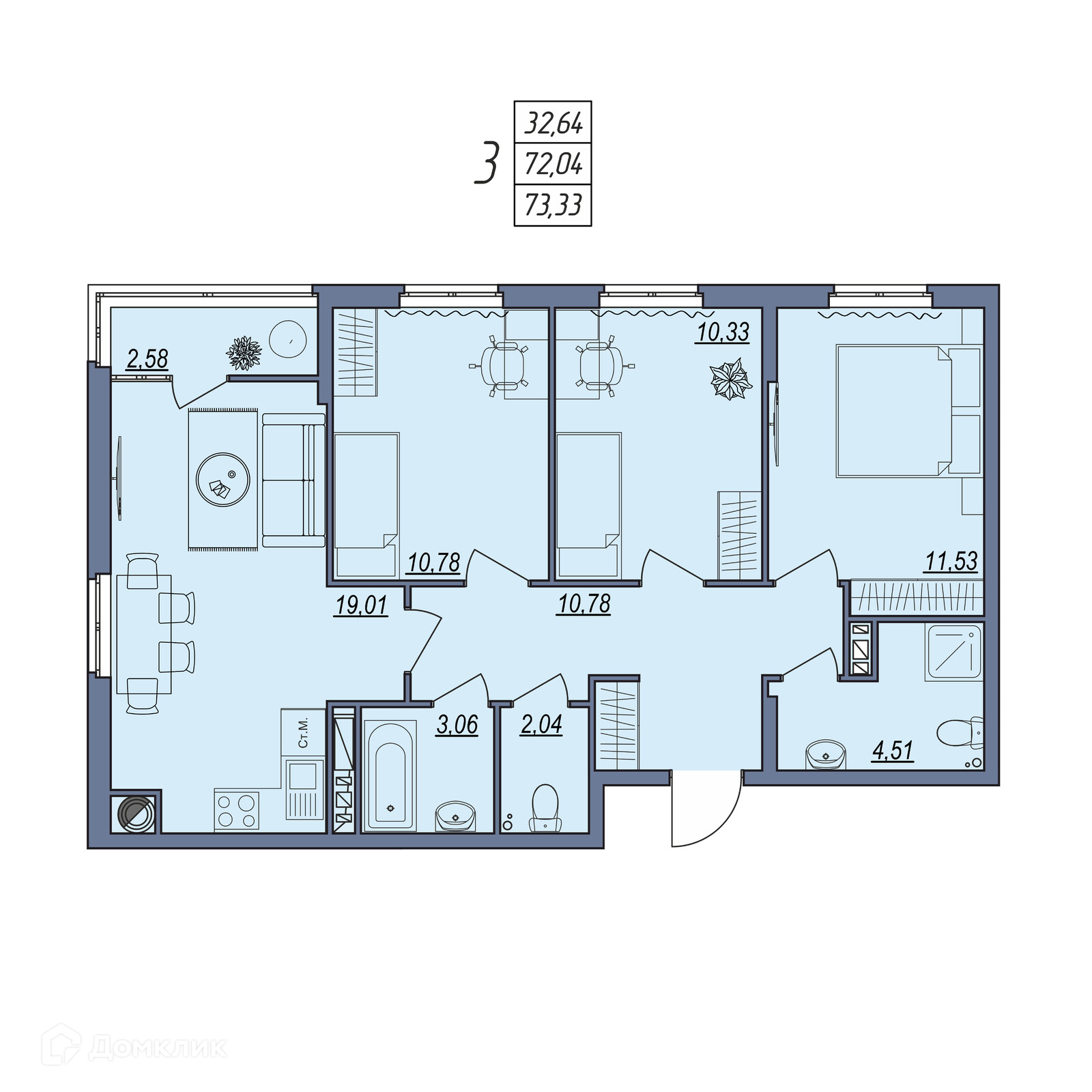 ✅ Кухня: 19.01 м² — эргономичное пространство.