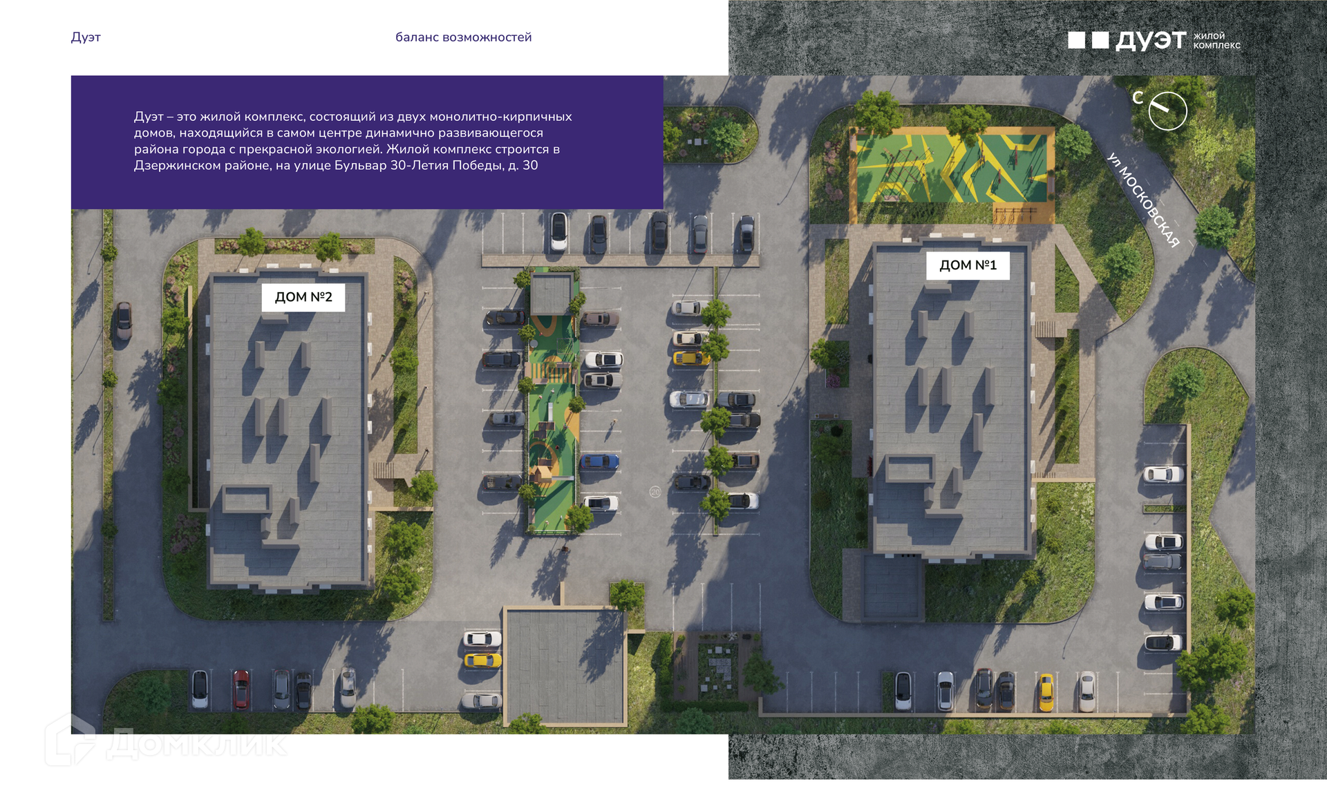 Дуэт — двойное удовольствие от жизни. Новый жилой комплекс в Дзержинском районе, на Бульваре 30 -летия Победы, 30. Два 18-этажных дома на благоустроенной территории создают особый ансамбль — «ДУЭТ», в котором хочется жить активной жизнью. В архитектурном облике «ДУЭТА» воплотились современные градостроительные тенденции. Сочетание благородных природных оттенков в фасадном решении, витражное остекление, корзины под сплит-системы создают стильный и элегантный внешний вид комплекса. Внутридомовая территория ЖК «ДУЭТ» — это место, в котором вы будете отдыхать, заниматься спортом, встречаться с друзьями и играть с детьми. Для ценителей здорового образа жизни на территории ЖК предусмотрена спортивная площадка. Также в проекте благоустройства территории запланировано оригинальное озеленение с элементами ландшафтного дизайна, беседки. Функциональные планировочные решения позволят будущим жителям эргономично организовать окружающее пространство. Благодаря высоким потолкам 2.7 м и грамотно распланированной площади даже в самой компактной квартире будет много света и воздуха.