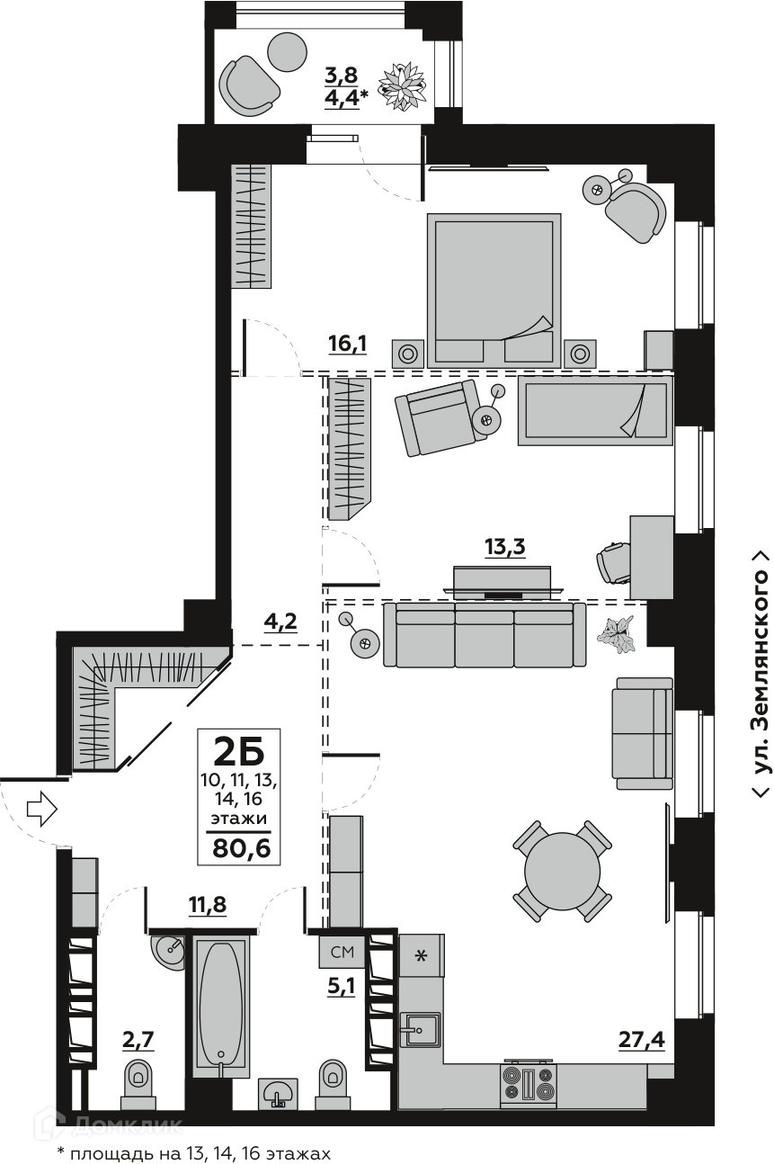 Квартира расположена на 13-м этаже 22-этажного дома.