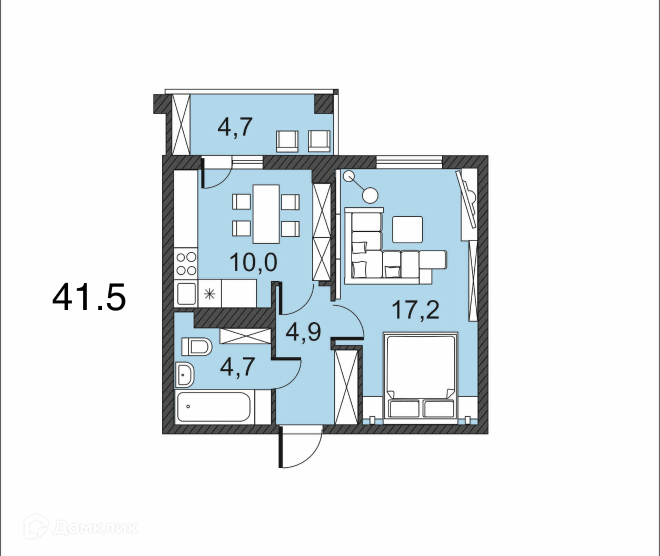 - Общая площадь: 41.5 м²