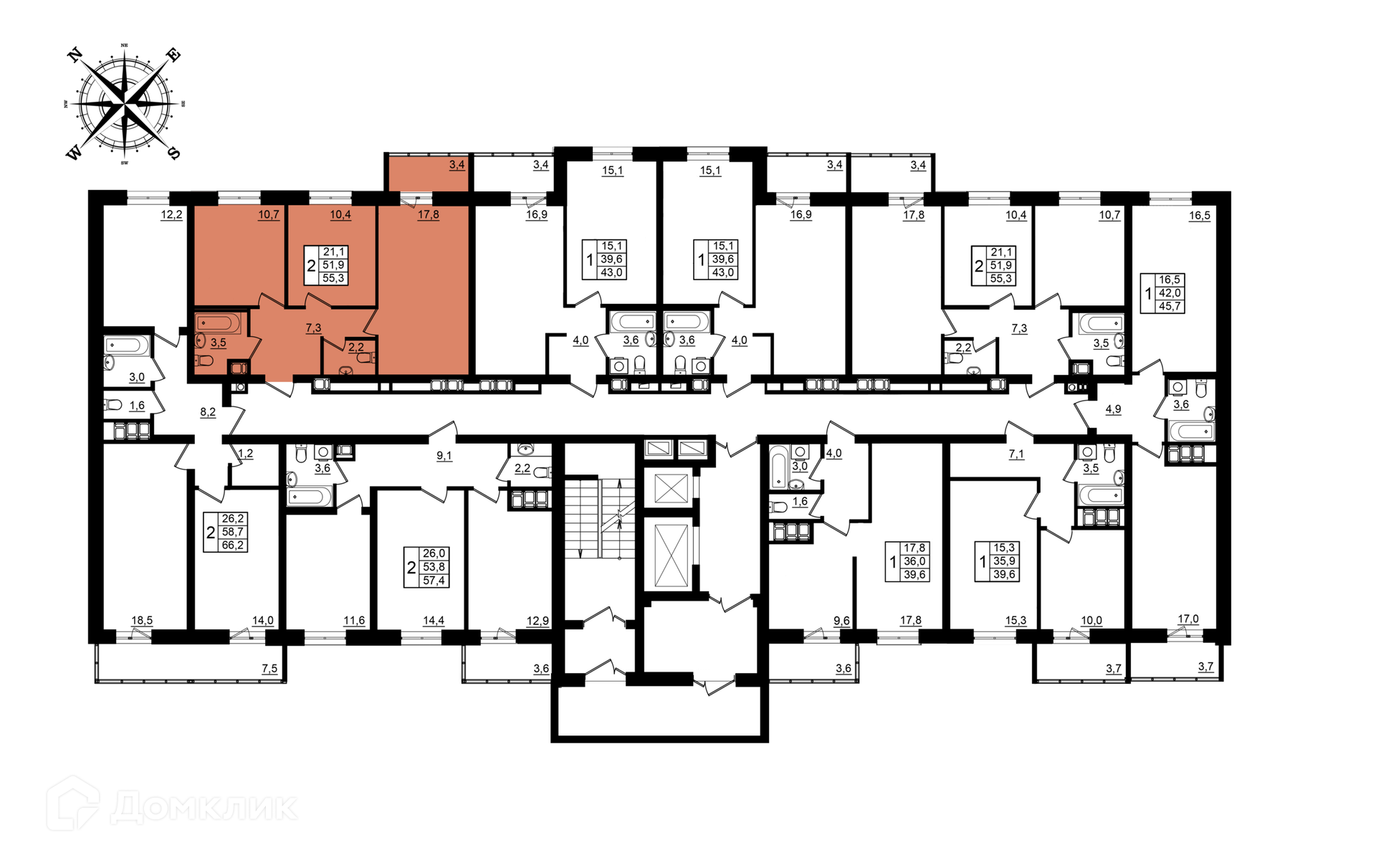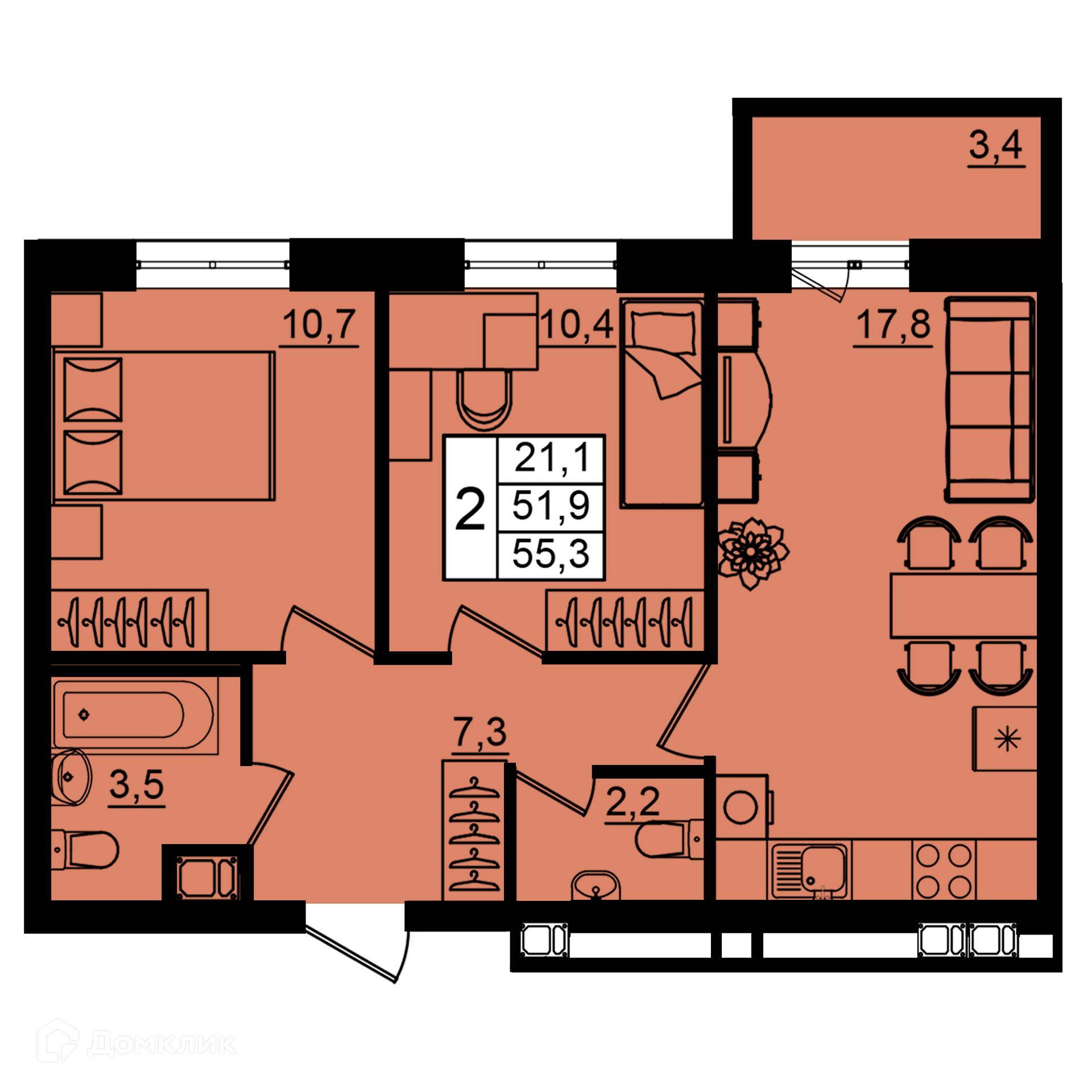 - Общая площадь: 55.3 м²