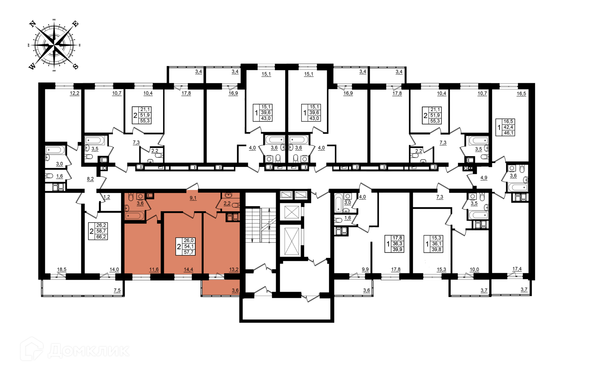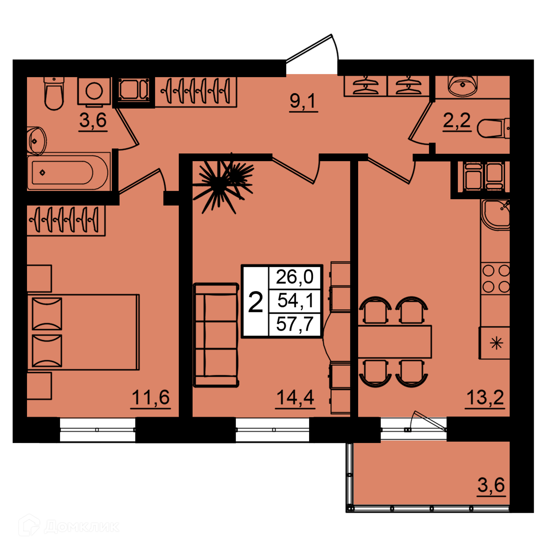 - Общая площадь: 57.7 м²
