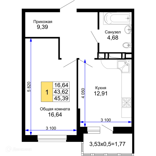 1 комн. квартира в Краснодаре в ипотеку от 43 502 руб/месяц