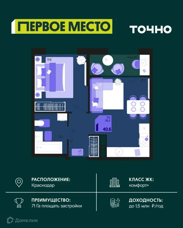 1 комн. квартира в Краснодаре в ипотеку от 42 553 руб/месяц