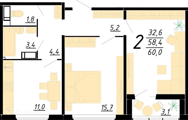 2 комн. квартира в Воронеже в ипотеку от 41 132 руб/месяц