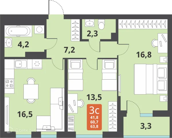 3 комн. квартира в Новосибирске в ипотеку от 68 733 руб/месяц
